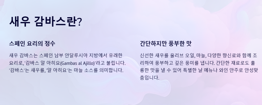 새우 감바스는 스페인 남부 안달루시아 지방에서 유래한 요리로, 특히 바르셀로나를 비롯한 해안 도시에서 큰 인기를 누리고 있습니다. ‘감바스 알 아히요(Gambas al Ajillo)’라는 정식 명칭에서 ‘감바스(Gambas)’는 새우를, ‘알 아히요(al Ajillo)’는 마늘 소스를 의미합니다. 즉, 마늘 소스에 조리한 새우 요리라는 뜻이지요. 신선한 새우를 올리브 오일과 마늘, 그리고 다양한 향신료와 함께 조리하여 풍부하고 깊은 풍미를 내는 것이 특징입니다. 간단한 재료만으로도 훌륭한 맛을 낼 수 있어, 가정에서 손쉽게 만들어 특별한 날의 메뉴나 와인 안주로 즐기기에 안성맞춤입니다.