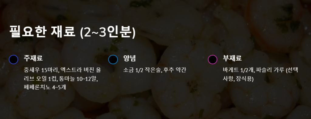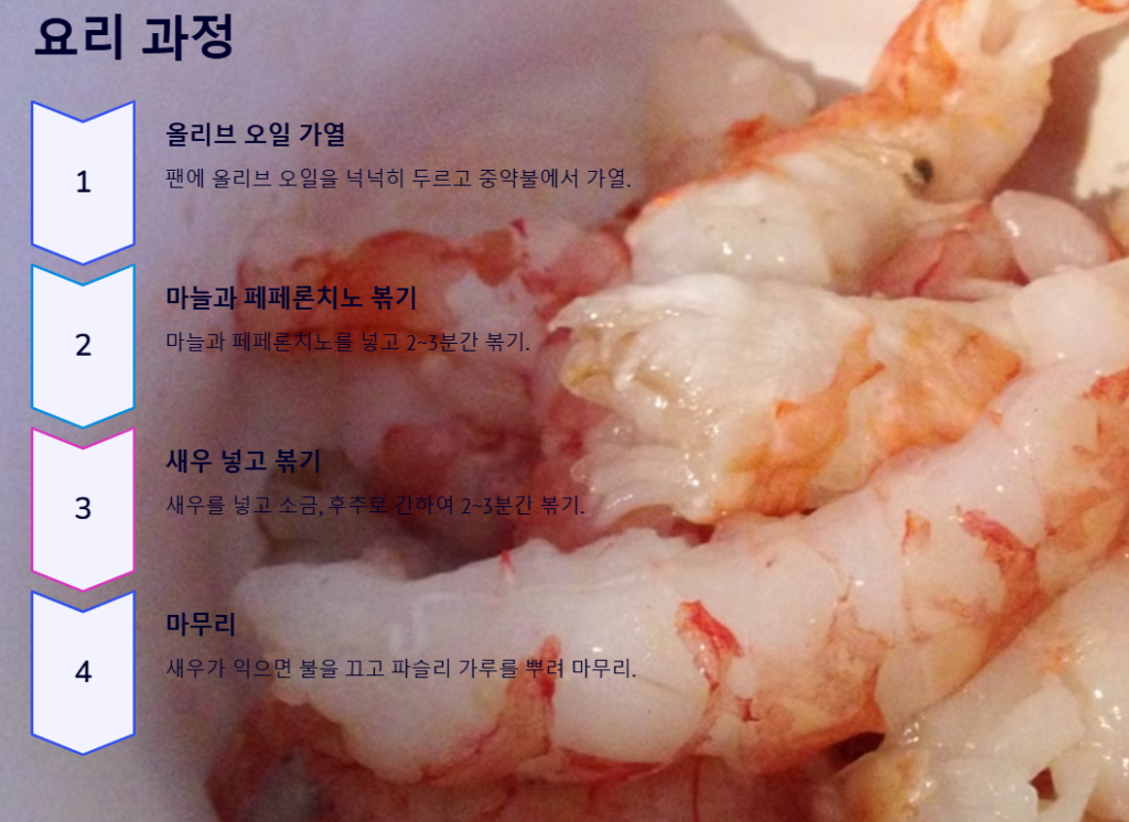 - 마무리: 새우가 완전히 익으면 불을 끄고 파슬리 가루를 뿌려 마무리합니다.