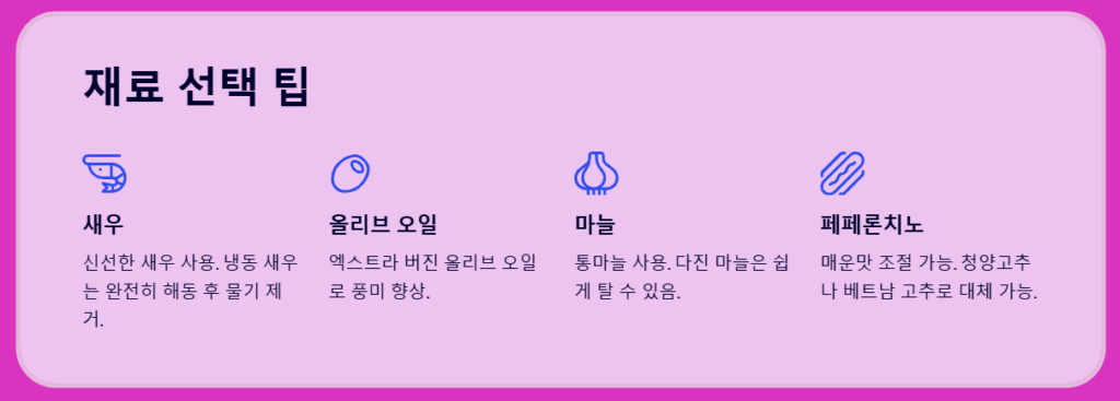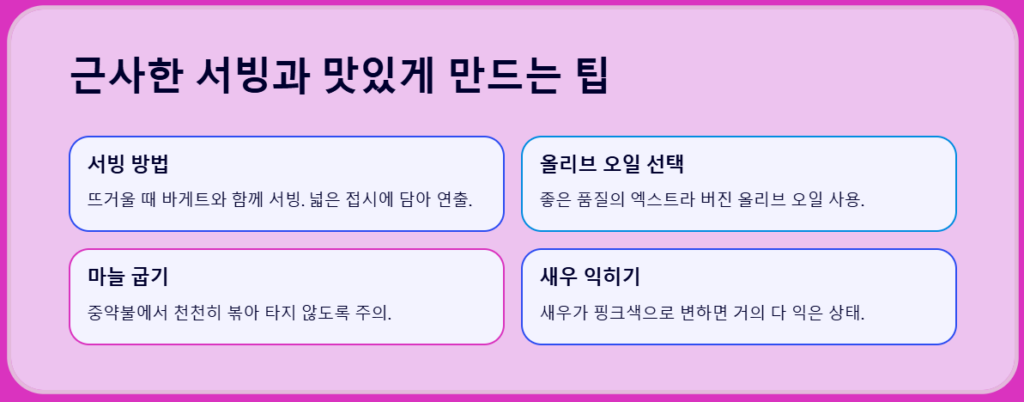 - 올리브 오일의 선택: 좋은 품질의 엑스트라 버진 올리브 오일을 사용하면 감바스의 풍미가 훨씬 좋아집니다.