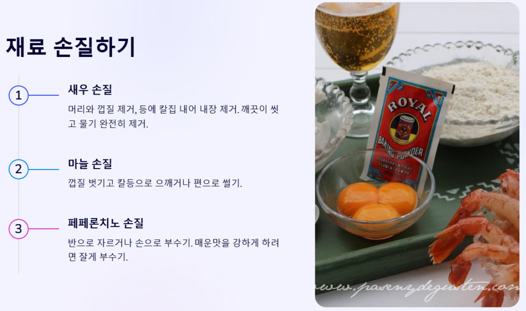- 새우: 신선한 새우를 사용하는 것이 가장 중요합니다. 냉동 새우를 사용할 경우 완전히 해동 후 물기를 제거해야 기름이 튀는 것을 방지할 수 있습니다.