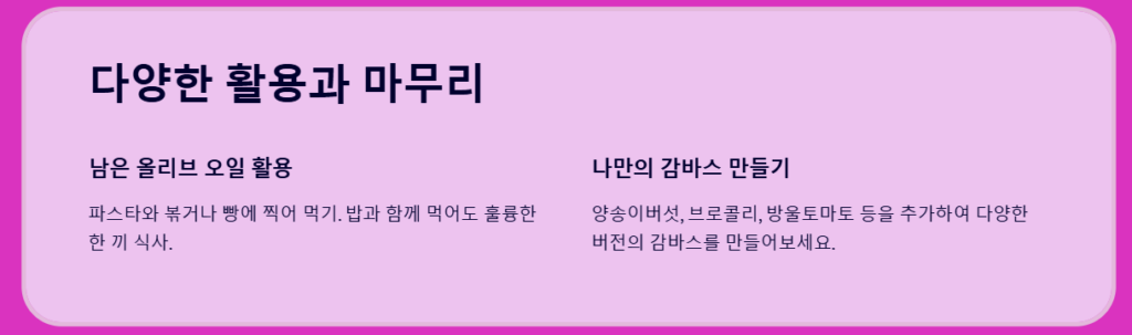 - 올리브 오일: 엑스트라 버진 올리브 오일을 사용하는 것이 풍미를 더욱 풍부하게 해줍니다.